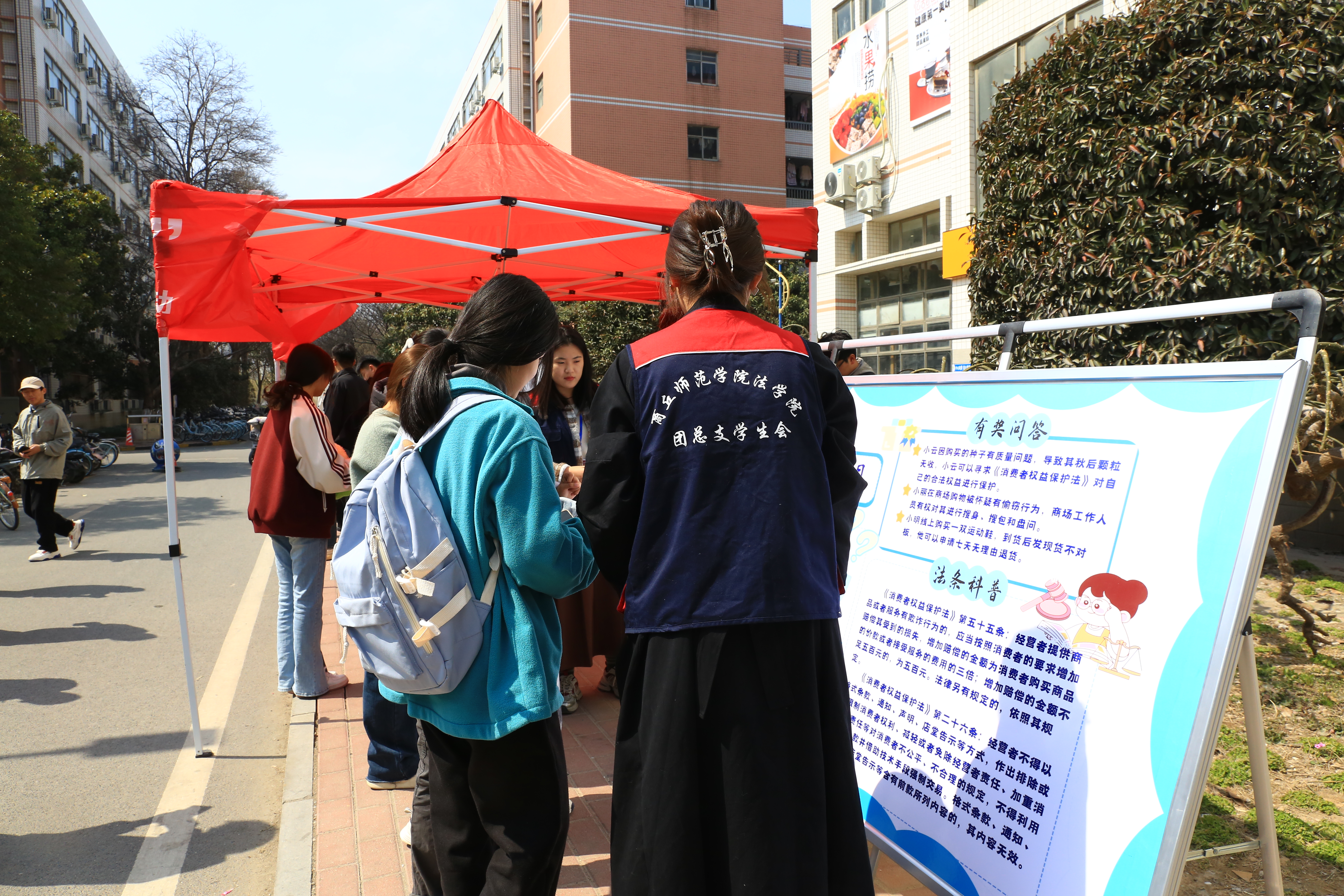 活动现场,公司活动志愿者通过“找出假冒伪劣产品、题目有奖问答、手持板子”三个不同形式的环节,生动形象地向大家普及商品交易中存在的消费陷阱、欺诈行为及消费者享有的合法权利、维权途径、维权过程中应注意的事项等知识。同时志愿者以案说法,进一步对相关法条做出科普,为同学们答疑解惑,增强大家的鉴假维权能力,并号召同学们理性消费,运用法律手段维护自身合法权益。