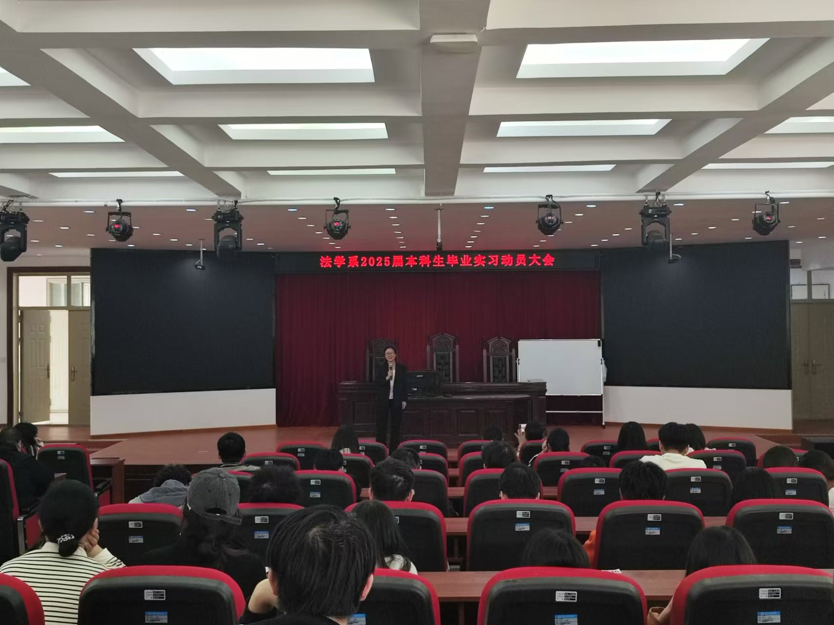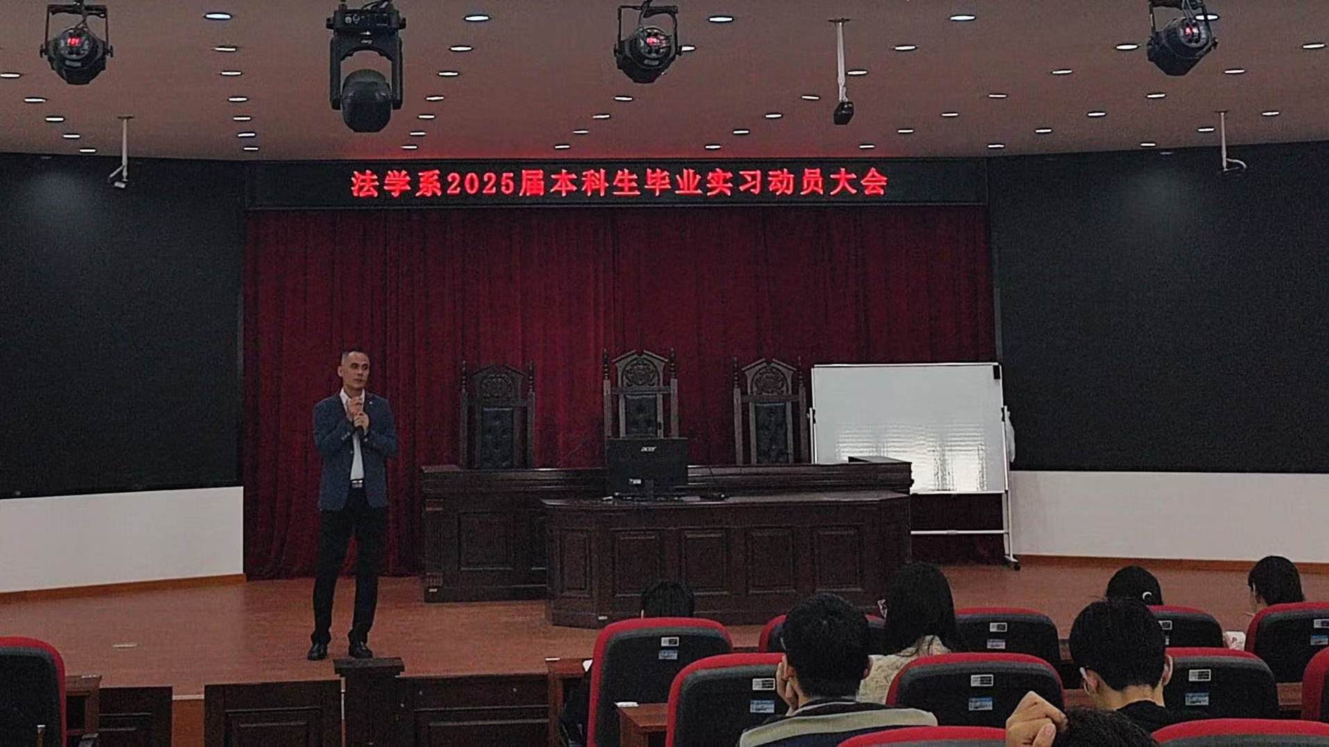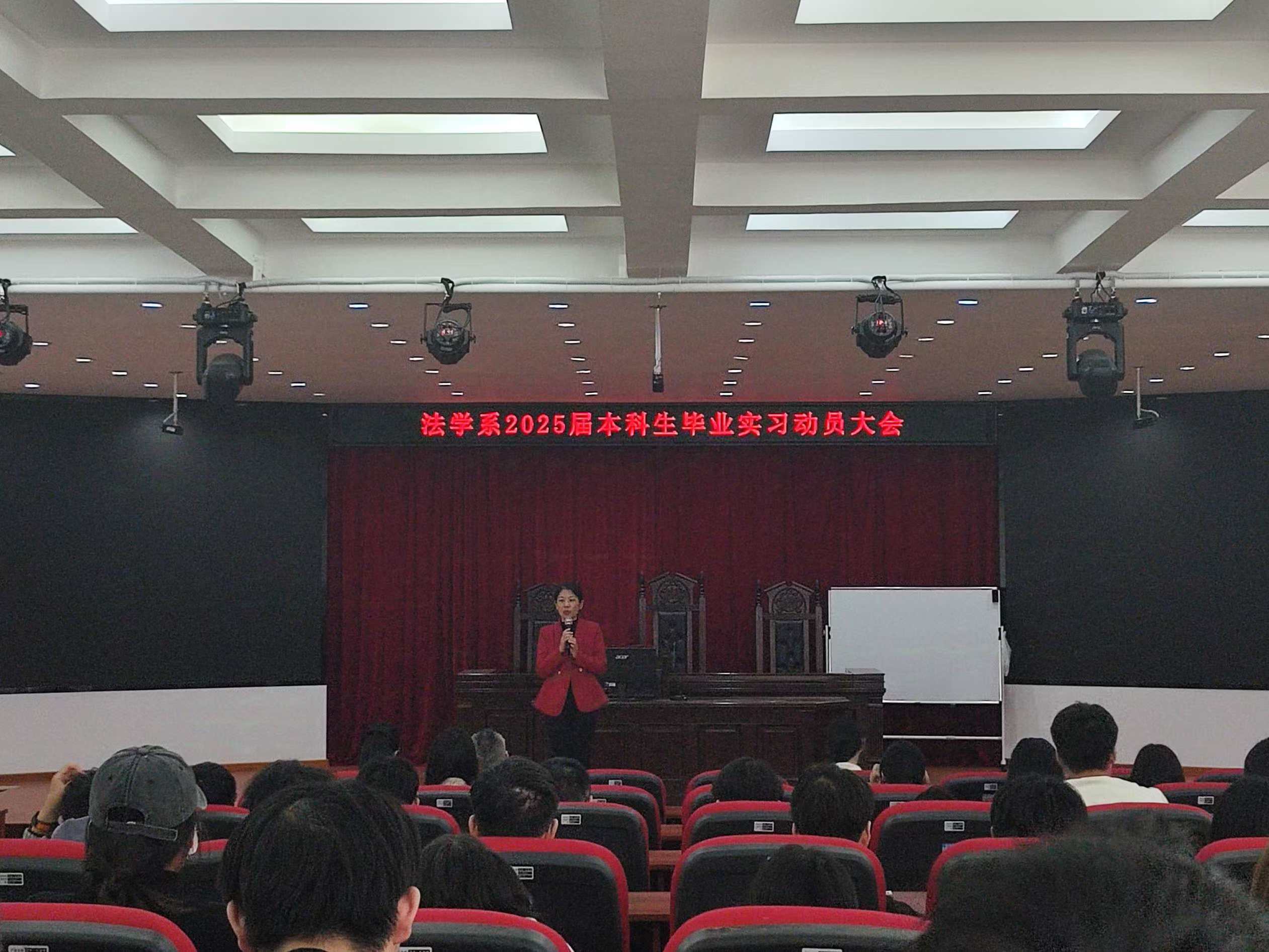 进一步引导员工明确实习要求,确保实习工作的顺利开展,法学系在行方楼模拟法庭召开2025届本科生毕业实习动员大会。公司党委副书记郭静、法学系主任李祎、公共法律教研室主任王伟和实习指导老师、法学专业实习生参加大会。会议由李祎主持。